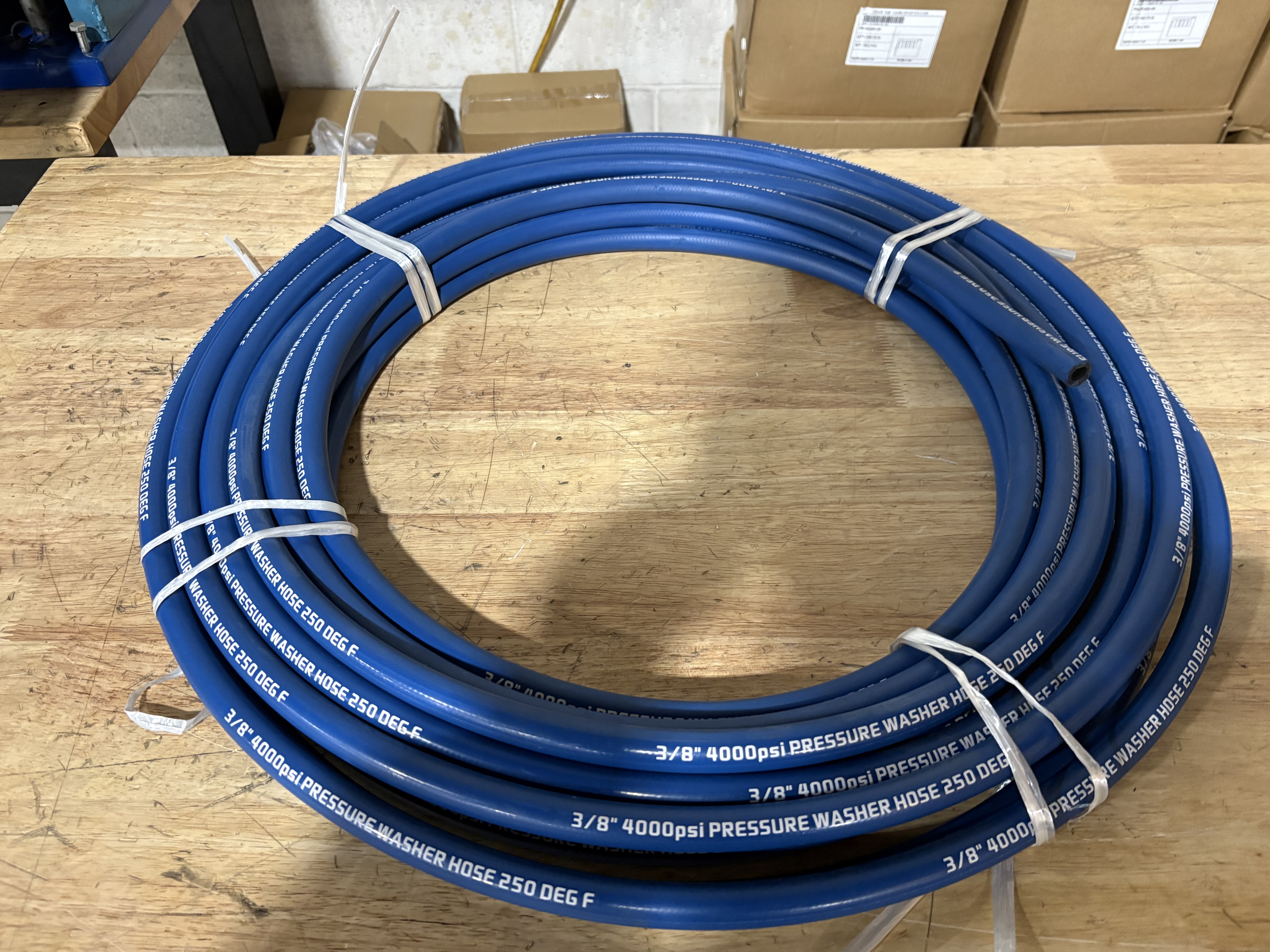 The hose is 3/8 inch 1SC specification. 18lbs/100ft, 3.50 inch bend radius 250F temperature rating.