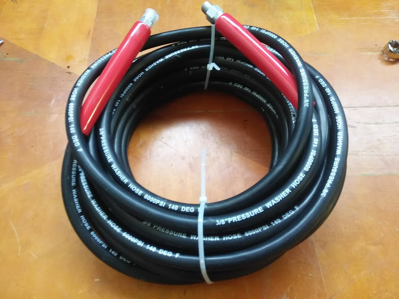 4000psi 3/8 inch wrap cover pressure washer hose is 0.650 inches outside diameter, weighs 18lbs/100ft. has a bend radius of 2.50 inches. A temperature rating 250F