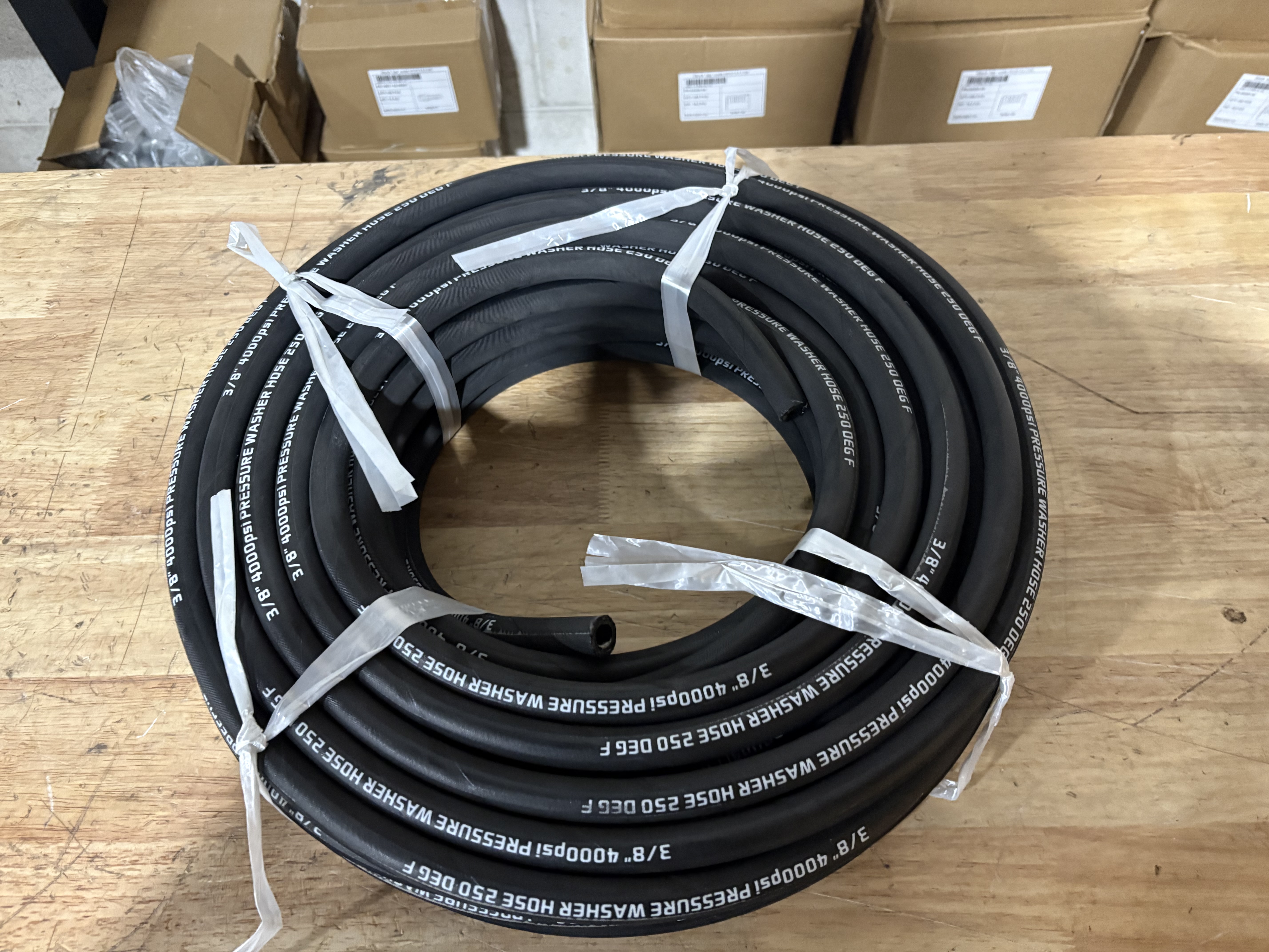 The 4000psi hose is 3/8 inch 1SC specification. 18lbs/100ft, 3.50 inch bend radius, 250F temperature rating.